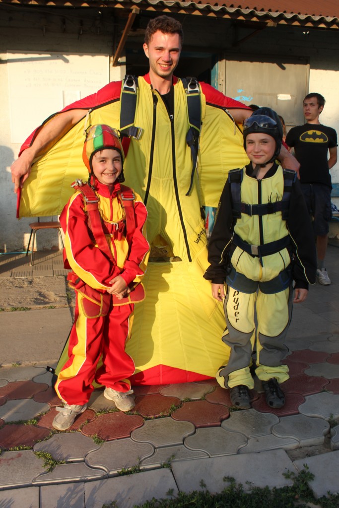 Наши маленькие парашютисты, Вероника (8 лет) и ее брат Коля (10 лет), с человеком-птицей, Владом)